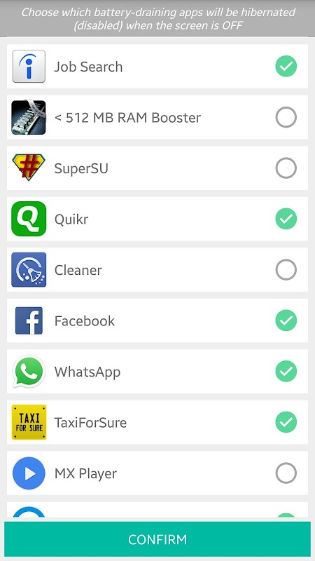 Choose which battery-draining apps will be disabled (hibernated) when the screen is OFF.