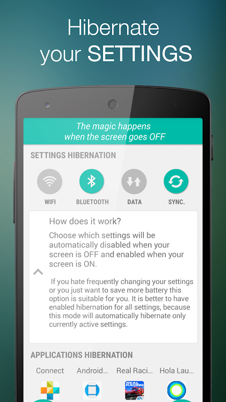 Устройства на Android созданы чтобы работать постоянно, даже когда Вы не пользуетесь ими! Hibernation Manager поможет экономить заряд батареи в то время когда вы не пользуетесь своим устройством. Когда экран отключен, процессор (CPU), настройки и даже приложения будут усыплены для экономии энергии.