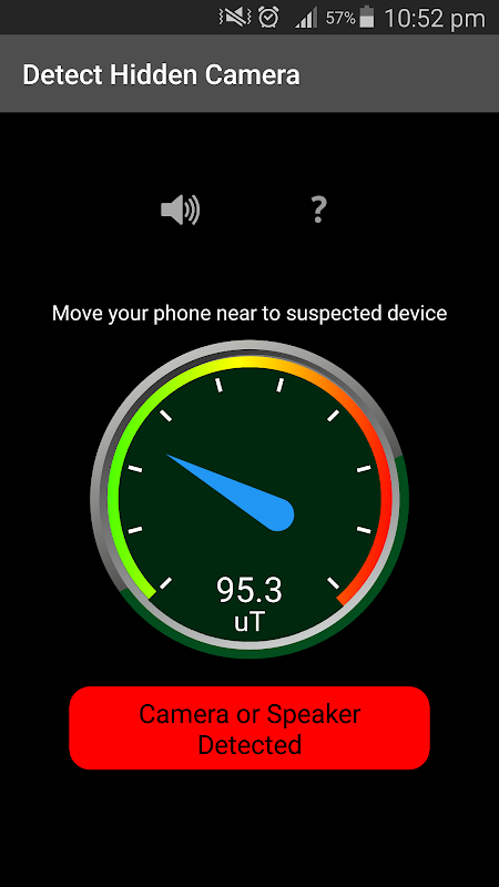 Open hidden camera detector - anti spy cam and Press the "Detect Using Magnetic Sensor" button to start detecting. You just need to move your device/phone around the suspected area. If the magnetic field values rise then there is a chance that there is a spying hidden camera or hidden microphone in that area. The hidden camera detector - anti spy cam will beep if it detects any spying device nearby. You can turn the beep on or off by tapping the speaker button on top.