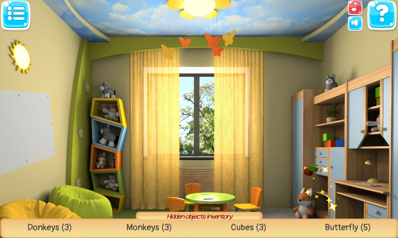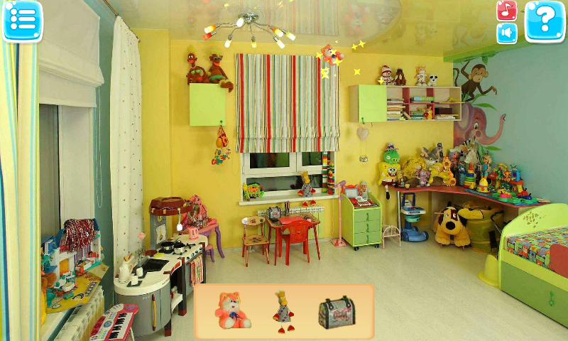 Несложная игра в стиле “Найди предметы” или “Поиск предметов”. С простой механикой и легкими правилами игры. Действие игры происходит в жилых комнатах, такие как детская, кухня, гостиная, спальня и ванная комната. Вам предстоит найти все предметы, которые были аккуратно разбросаны по комнате и хорошо замаскированные, чтоб Вам сложнее было найти их. Придется сильно постараться, чтоб найти нужный предмет из списка. Игра полезна для развития внимательности и памяти.