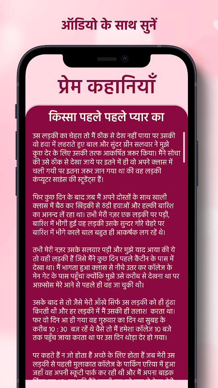 There are short romantic stories which will excite and arouse your romantic desires and you will start loving this app and use it again and again. There is a particular love story where couples have wonderful conversation of romance. This love story app in hindi is designed for audience speaking hindi. This is a virtual love story book that you will enjoy using and will want to share it with friends