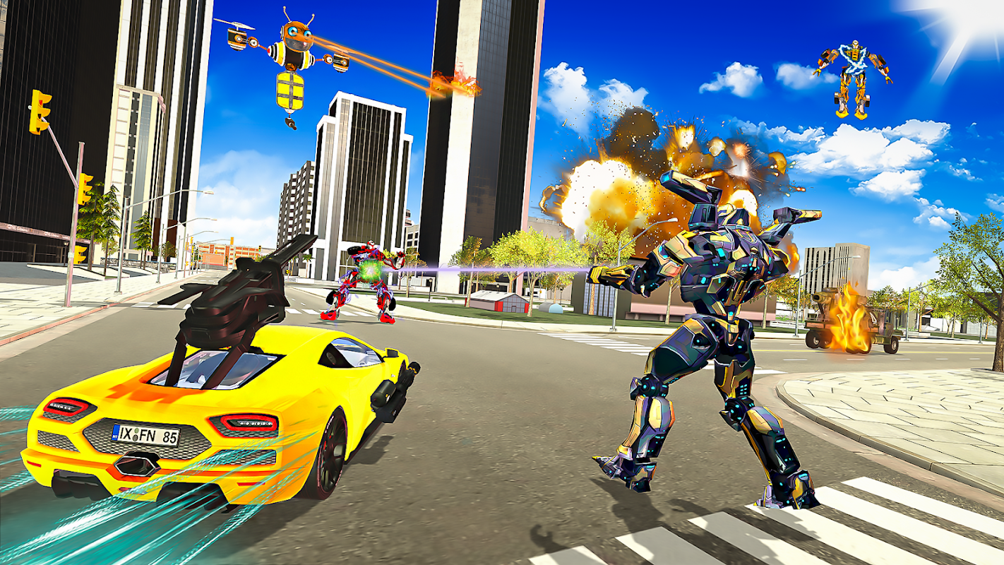 Игра-трансформер-робот-медоносная пчела - это новое дополнение для тех, кто любит играть в игры-трансформеры и игры с летающими роботами. Шагните в машинный мир роботов и наслаждайтесь военным шутером с пчелиным роботом. Эта трансформация робота-пчелы предназначена для превращения ботов в летающую машину для выполнения миссий игр-трансформеров роботов или игр-файтингов. Играйте в военную игру роботов-медоносных пчел в великом городе гангстеров и используйте свои боевые навыки летающих роботов, чтобы спасти город от злых сил в футуристических играх-трансформерах-роботах. Многочисленные враги-роботы и их космические корабли замечены в некоторых местах, где начнется городская битва против преступных роботов в играх с автомобильными роботами, где вы должны сражаться как непобедимая машина в симуляторе пчелиного робота.
