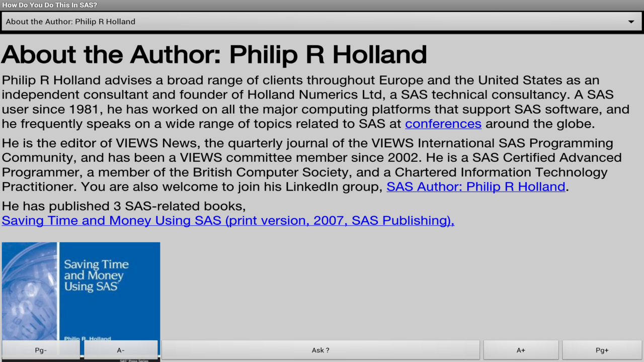 Это приложение, "How Do You Do Это В SAS?", Является свободным введение в серию электронных книг о программировании программного обеспечения SAS, направленных на часто задаваемые вопросы и ответы, иллюстрируется примерами кода, которые могут быть отправлены по электронной почте непосредственно из приложения. Серия книг была разработана, чтобы стимулировать пользователей способствовать вопросы, некоторые из которых будут включены в будущие версии приложения. Есть элементы управления для выбора конкретных вопросов, перехода к предыдущему или следующему вопросу, уменьшить или увеличить шрифт соответствии с предпочтениями пользователя, и отправлять электронную почту с просьбой ответы на вопросы, еще не включенных в этой версии книги.