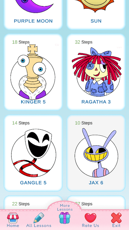 Что делать в приложении? Для начала выберите персонажа, которого хотите нарисовать. Это могут быть CAINE, GANGLE, Gloink Queen, JAX, Kaufmo, KINGER, POMNI, RAGATHA, ZOOBLE и другие. Выбрав героя, приступайте к уроку! Повторите все действия, данные в уроке, и вы легко нарисуете выбранного героя мультфильма. Поверьте, вам не нужен ни опыт, ни навыки рисования. Все получится! Следуйте урокам приложения Как нарисовать потрясающий цифровой цирк шаг за шагом, и результат не заставит себя долго ждать!