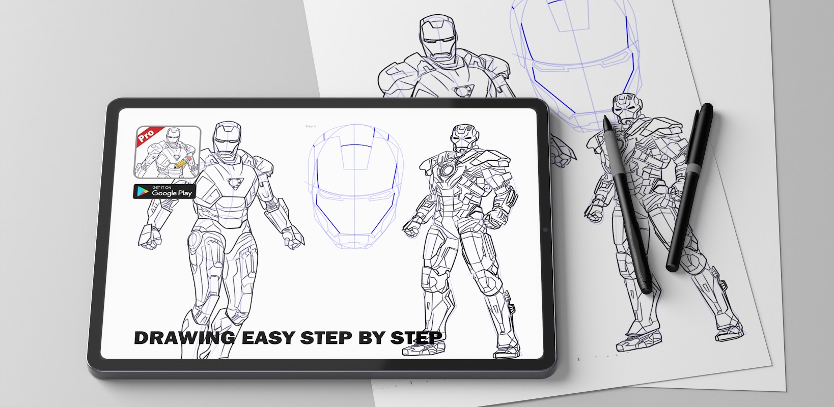 The “How to draw Iron suit characters step by step” app is an unique application that teaches you how to draw suit characters on a piece of paper.