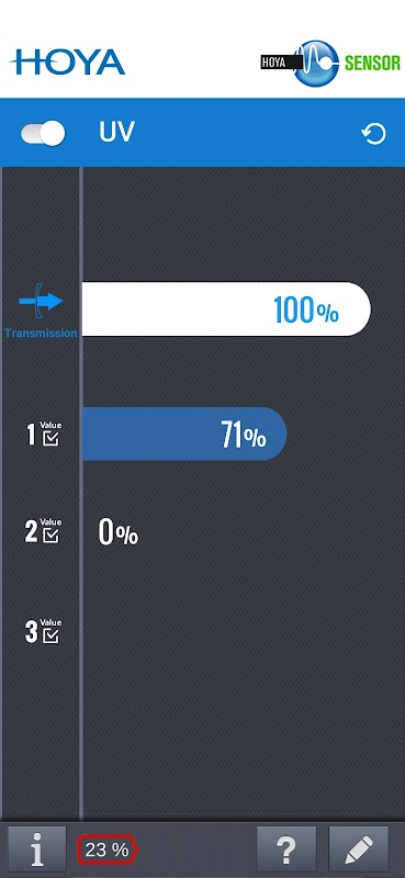 Приложение включает в себя уникальное меню, которое позволяет вам проводить измерения синего и ультрафиолетового света от таких источников света, как планшеты, люминесцентные лампы и т. д., с помощью сенсорного модуля HOYA.