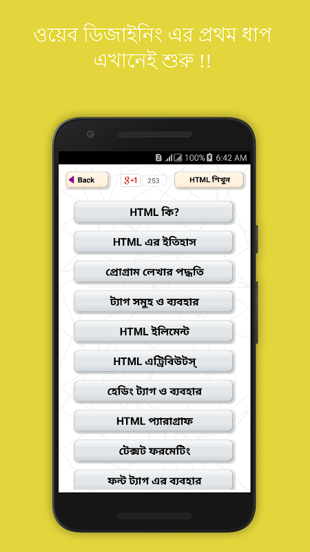 এই অ্যাপটিতে HTML ল্যাঙ্গুয়েজ এর যে টপিক ও টিপস যুক্ত করা হয়েছে তা হল -