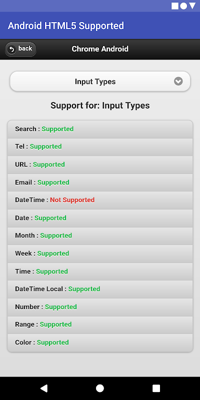 Обнаружение поддержки таких функций HTML5, как Canvas, Border Radius, CSS-анимация и преобразования, 3D и WebGL, LocalStorage, HTML5-видео и многие другие для последних версий Android. Использование Android HTML5 поддерживается для реализации красоты HTML5 в ваших мобильных веб-приложениях и веб-сайтах.