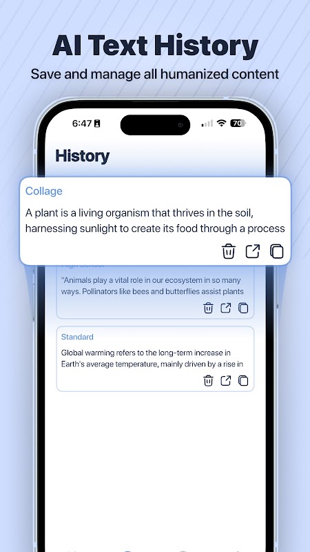 Humanize AI — лучший инструмент для очеловечивания текста с помощью ИИ, который преобразует сгенерированный ИИ контент в естественный, похожий на человеческий текст. Независимо от того, используете ли вы ChatGPT, GPT-4 или любой другой генератор ИИ, наш конвертер ИИ в человеческий текст делает ваш текст, созданный ИИ, абсолютно незаметным для инструментов обнаружения ИИ. Преобразуйте роботизированный текст в увлекательный, плавный и похожий на человеческий текст с помощью Humanize AI.