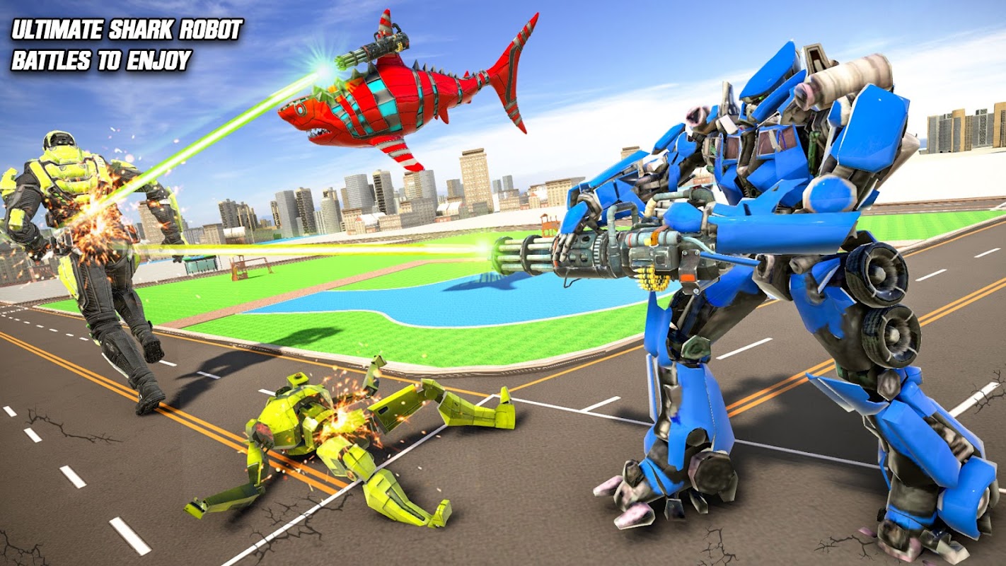 Robot transforming games are now converted into robot shark games were an incredible shark attack is fighting against evil forces. Rescue crime city with a multi-robot transformation including robot war games skills of shark simulator games and skills of transforming robots as vigilant police bike in crime city robot war games. Futuristic transform robots battle will give you the most thrilling experience of flying US police robot games and angry shark attack. For the fans of US police flying robot games or angry shark simulator vs evil robots, this warrior shark games is highly recommended in robot fighting games.