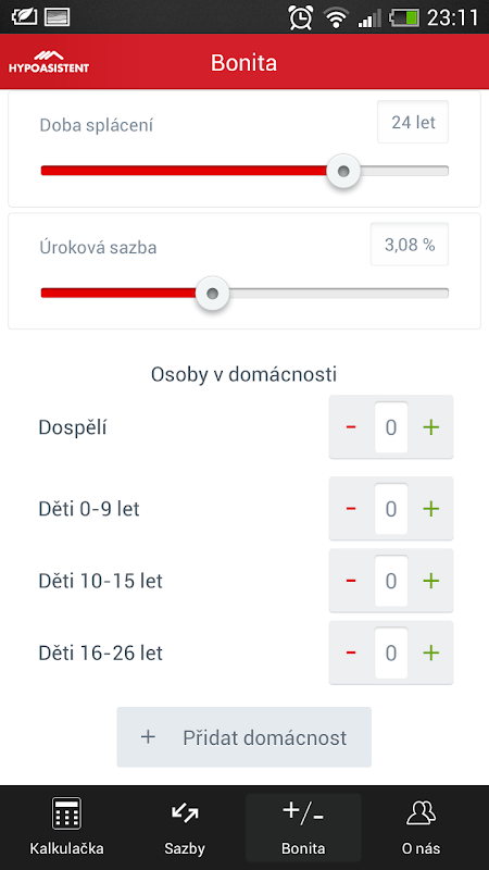 V aplikaci HYPOASISTENT najdete hypoteční kalkulačku, úrokové sazby, porovnání hypoték i ověření Vaší bonity. Všechny výpočty jsou orientační, pro získání přesných výpočtů nás kontaktujte a zdarma připravíme přesnou nabídku. Pokud Vás čeká konec fixace či otázka refinancování hypotéky, jistě oceníte aktuální úrokové sazby pro dané fixace, sledovat můžete také vývoj mezibankovní sazby PRIBOR u Vaší hypotéky s pohyblivou sazbou.