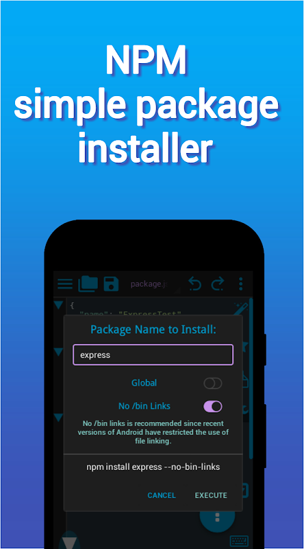 ⚠ NOTICE: npm packages that have source files built on the device (c++ make) will not work on Android. Android does not have a 'build' system to handle these packages. This is not a Icode-NodeJs restriction or flaw, it is beyond our control. All pure JavaScript packages will run perfectly.