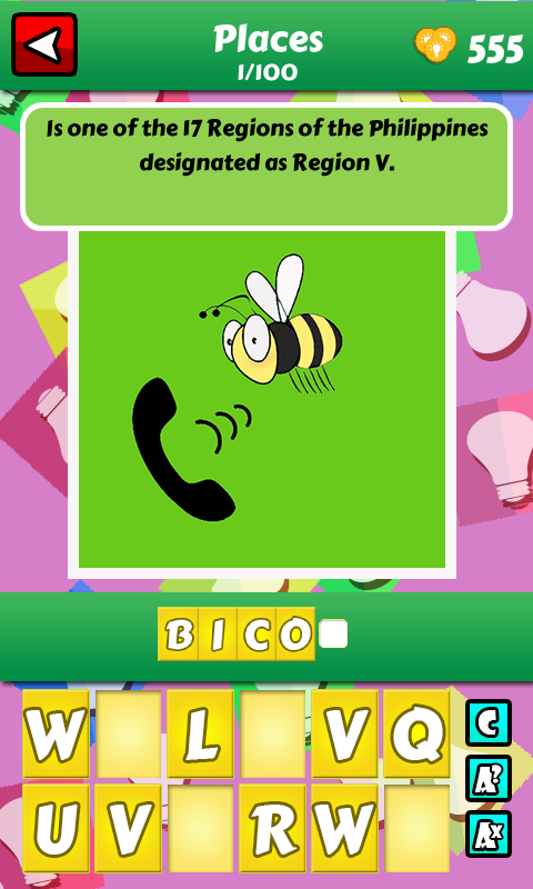 It has four categories (Human, Animals, Places and Foods) that can be selected in the game. And each category consists of 115 (45 for easy level, 40 for medium level and 30 for difficult level) images with questions to be answered.