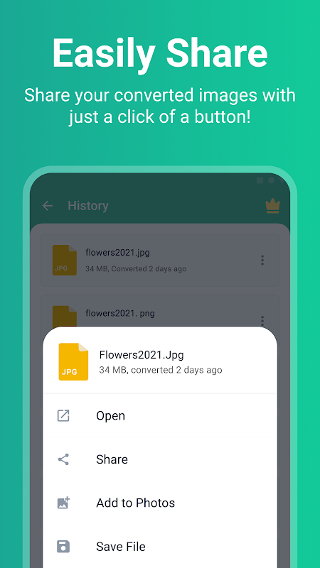 Выберите изображение со своего телефона и выберите целевой формат. Затем просто нажмите «Конвертировать»! Это так просто. После конвертации вы можете легко поделиться своими фотографиями с друзьями.