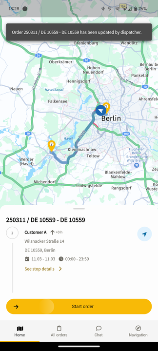 - Обновление статуса заказа на каждой остановке: обновляйте статус каждой остановки — начало погрузки, завершение погрузки, заправка, отдых или ожидание. Документируйте время ожидания с помощью GPS-отслеживания местоположения в качестве доказательства.