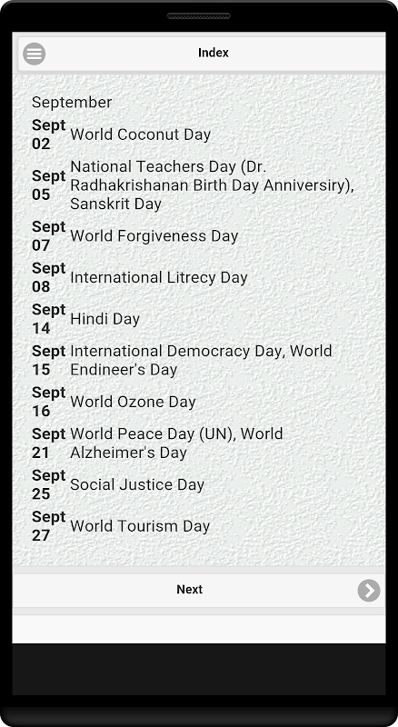 Как правило, мы узнали, что сегодня День отца, и сегодня день матери. Но каждый год мы теряем их, или приходят, чтобы узнать, когда дата проходит. Чтобы держать вас в курсе, мы писали эту образовательную приложение в контексте Индии, которая расскажет вам о каждом месяце с важных дней и дат.