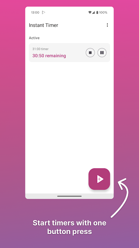 Other timer apps usually require you to first set a duration before the timer can start. With Instant Timer, it's the other way around: First, you start a new timer. Then, while this timer is already running, you set its duration. This is why timers can be started so quickly.