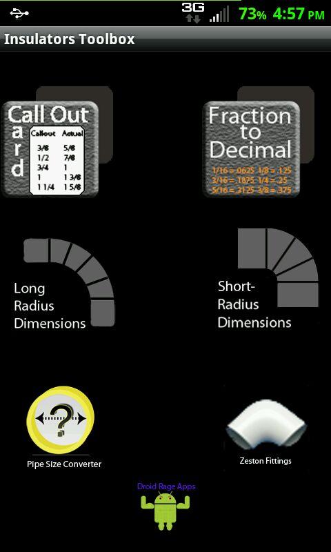 New and improved!! Now called Insulator's Toolbox. This app now includes a callout card and and fraction to decimal conversions, no need to worry about losing your card anymore! Also features long and short radius elbow dimensions! Just enter the pipe size, insulation thickness, and the number of miters you wish to use and viola! You have the measurements you need with 0 math on your part! Dont worry, the old Pipe Size Converter is still here, find actual outside diameter of a pipe, the radius, and circumference with and without insulation. Also converts circumference back to diameter when you can't "eyeball" the diameter of the pipe. Inside the converter (with a press of the menu button) you'll still find lateral Y measurements and metal/band lenghts. But thats not all, ever find yourself not near a chart of fitting numbers? Never worry about that again, the chart is also included in this app for FREE!! Thats right, I put in the extra effort combining my other app (proto/zeston fittings) with this one :D
