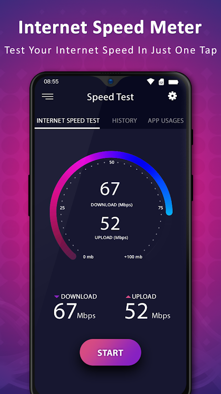 Измеритель скорости интернета с проверкой скорости загрузки и загрузки вашей сети в режиме реального времени, а также проверкой ежедневного, еженедельного, ежемесячного использования данных мониторинга в телефоне.