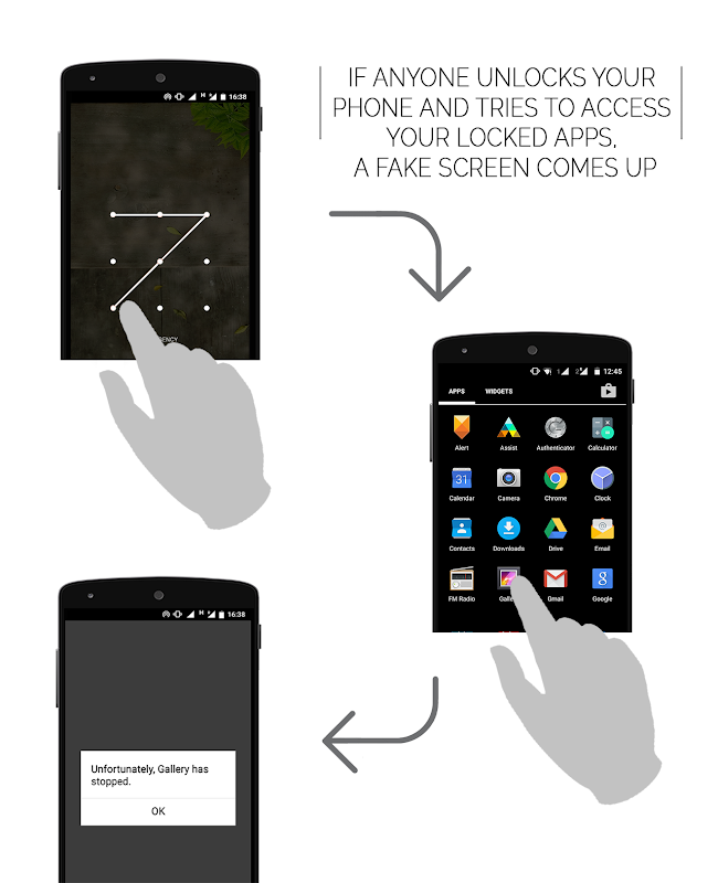2. Теперь, когда кто-то обращается ваш телефон и пытается открыть запертую приложение, подделка экран ошибки подошел бы, и он / она не будет иметь ни малейшего представления о том, что произошло! Единственный способ, чтобы получить доступ, чтобы сделать секретный жест по экрану поддельные ошибки.