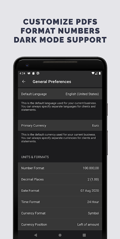 Отслеживание времени: Ваше время драгоценно - относитесь к нему как к такому. С помощью отслеживания времени счета вы можете вести учет времени, которое вы потратили на клиента, гарантируя, что вы всегда имеете полный контроль над своим временем. Отслеженное время может быть преобразовано в счета одним нажатием кнопки. Вашим клиентам больше никогда не придется ждать ваших счетов.