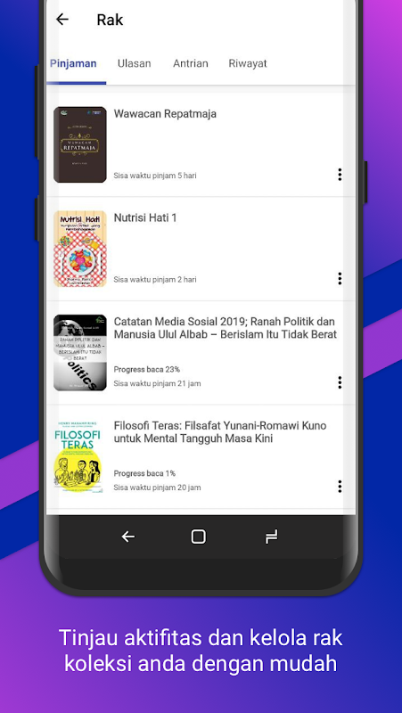 • Рак Буку : Мерупакан рак буку виртуальный милик Анда ди мана семуа ривайат пеминджаман буку терсимпан ди даламня, сехингга мемудахкан Анда унтук мембака буку ян телах дипинджам.