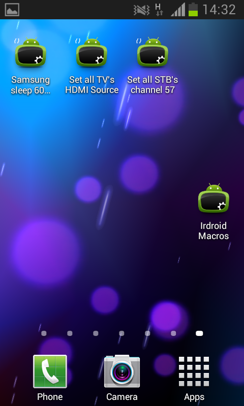 The application allows you to setup custom Infrared remote control sequences/macros, from the app main screen tap on Add in order to add new Macro. Enter the name of your new macro and tap on SAVE. In order to add command sequences to your new macro long click on the newly created macro and select "Edit Macro" a new screen will pop up and you can use the Add button to add custom commands to your newly created macro. To execute a macro just tap on the macro name. After you create your new macro you may create a custom shortcut to the macro by long tapping on the macro name from the list of macros. Tap on Shortcut and a new shortcut to your macro will be added to the home screen. Executing a macro from a shortcut is a matter of just tapping on the shortcut.