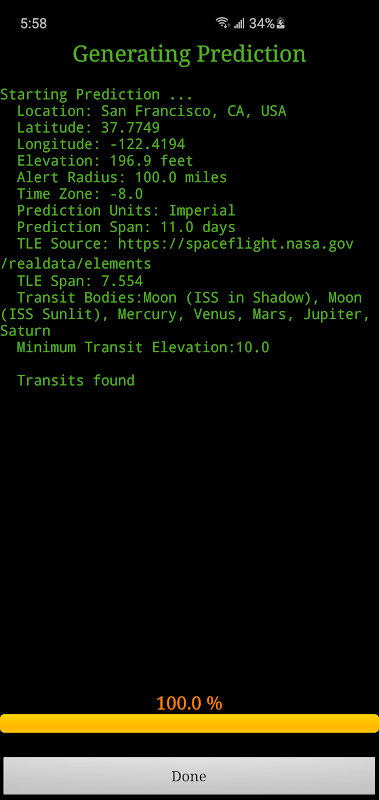 После ввода местоположения и загрузки TLE нажмите кнопку «Создать прогноз», чтобы начать создание прогноза. Индикатор выполнения показывает, сколько времени потребуется для завершения процесса. В зависимости от скорости вашего процессора создание прогнозов может занять несколько минут. Нажатие кнопки отмены отменит прогноз.