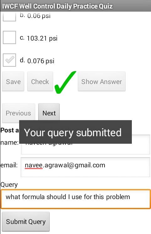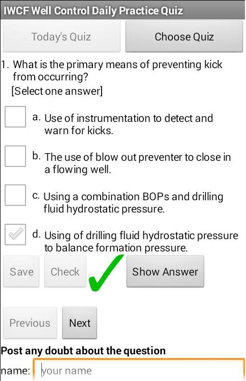 Получить вопросы IWCF Ну управления для практики. Различные набор вопросов обновляются reqularly. Улучшить подготовку к IWCF контроль скважины, принимая эти викторины ежедневно. Откройте приложение и найти различные вопросы каждый день. Вы также можете выбрать любой опрос из списка викторины.