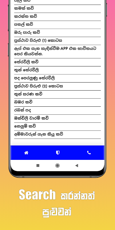 В этом приложении вы можете узнать все сингальские джана кави, прастха пирулу (сингальские пословицы), сингальский тхеравили, кматх баса, дивара баса и вади джана авахара.