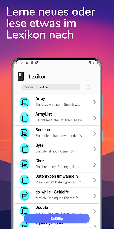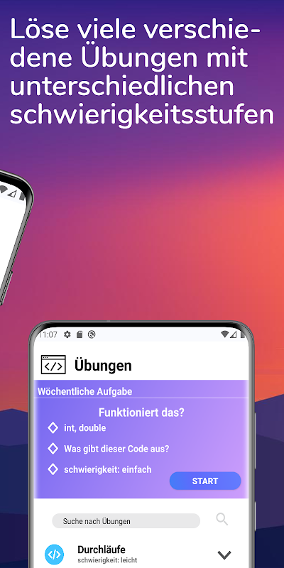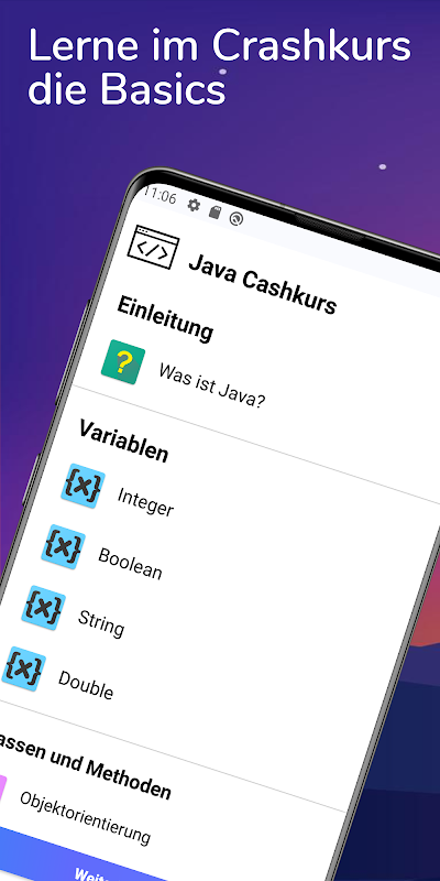 Ziel der App: In der App sollst du die Grundkenntnisse der weit verbreiteten Programmiersprache Java lernen. Wie zum Beispiel Variablen, Klassen, Methoden, Schleifen, if/else, Kommentare und Arrays.