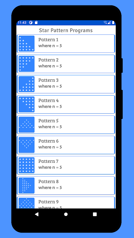 В этом приложении полно программ шаблонов Java, таких как звезды, числа, шаблоны алфавита.