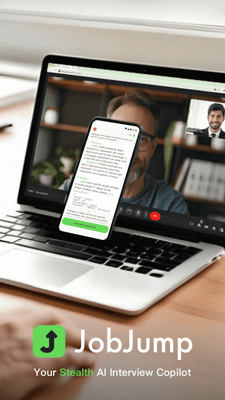- Второй пилот скрытого интервью: JobJump работает незаметно, гарантируя, что ваше собеседование пройдет гладко, не нарушая требований к совместному использованию экрана.
