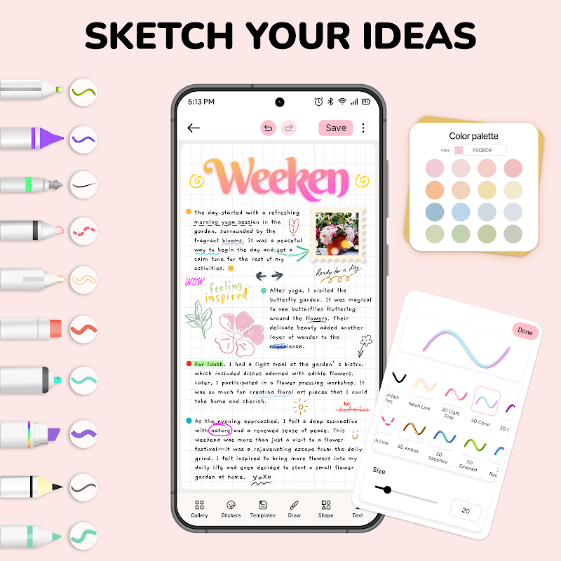 Делайте заметки, пишите документы, зарисовывайте идеи: приложение «Journal: Notes, Planner, Diary» работает как обычный физический блокнот. Вы можете делать заметки, проводить мозговые штурмы и планировать на виртуальных страницах, как на настоящих. Пишите на множестве настраиваемых шаблонов бумаги. Записывайте свои мысли, используя различные мультимедийные инструменты, включая карандаш, маркер и текст.