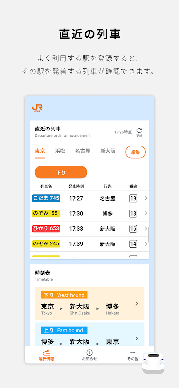●Последние поезда: зарегистрировав станцию Синкансэн, которую вы будете использовать, вы сможете проверять время и маршруты поездов, отправляющихся с этой станции.