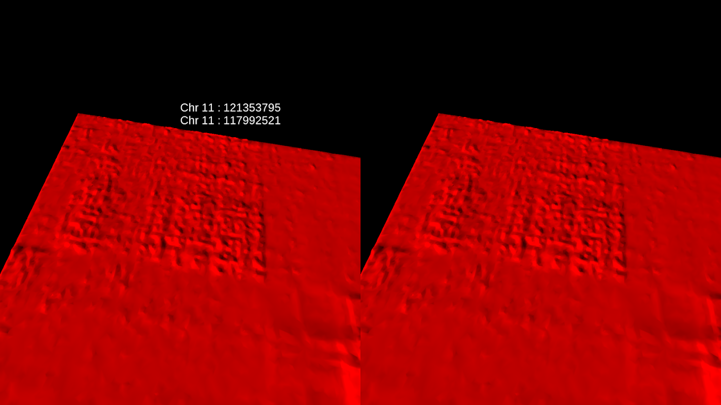 Juicebox VR создает виртуальное представление реальности данных, полученных с помощью метода Привет-C для трехмерного секвенирования генома. Каждый 2D положение в ландшафте соответствует паре 1D позиций или локусы, в три миллиарда букв длиной генома человека. Высота в 2D положение представляет, как часто два локуса находятся в контакте в ядре клетки.