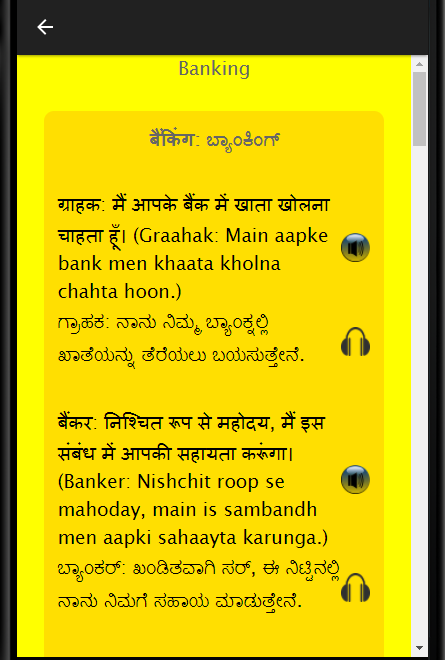 This language learning application can also be used by those Kannada speaking participants who are preparing for BPO, Call Center, Hindi Discussions and Debates as well as Hindi job interview. If you want to learn Hindi grammar, it is advised that you initially go through this application get yourself ready for your next assignment. If I want to learn Hindi, I should be approaching this application for the same and go through all the chapters. This app can help you learn Hindi fast using audio. It is easier to learn the language using Hindi conversation rather than through an Hindi Dictionary. Learning Spoken Hindi had never been easier. Exercises, vocabulary and business Hindi make this application a very special one.