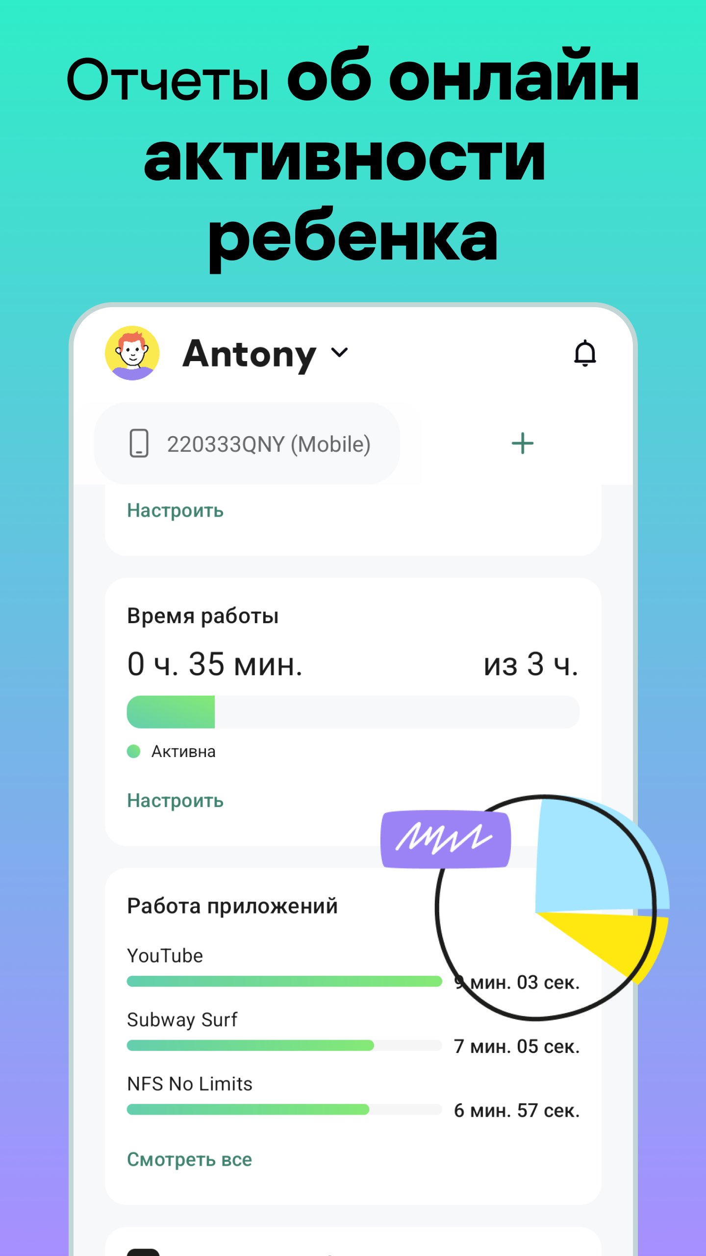 Оно позволяет вам блокировать нежелательный контент в YouTube и на других сайтах, контролировать использование устройств и приложений, мгновенно выявлять подозрительную онлайн-активность, а также видеть местоположение ребенка на карте, задавать безопасный периметр, в котором он может находиться, и отслеживать уровень заряда батареи на его устройстве, чтобы всегда быть с ним на связи.