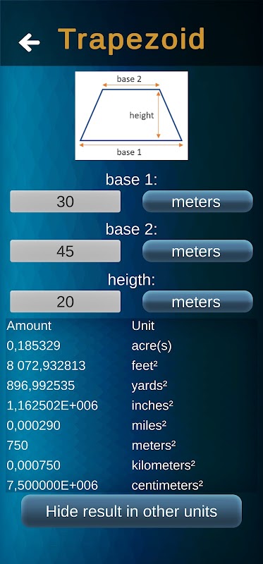 Инструмент площади принимает ввод в метрах, футах, ярдах, дюймах, милях, километрах и сантиметрах.