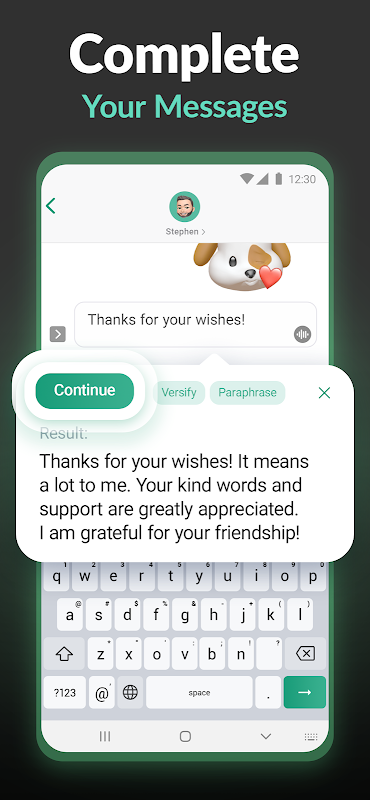 Благодаря нашей клавиатуре с искусственным интеллектом навигация по сложным сценариям общения не станет проблемой. Помощник предлагает альтернативные варианты написания для эффективной передачи вашего сообщения. Наш ИИ-писатель сообщений придет вам на помощь, если вам нужно извиниться, попросить о помощи, что-то уточнить и так далее. С помощью этой клавиатуры с искусственным интеллектом вы сможете выражать свои мысли более четко и уверенно.