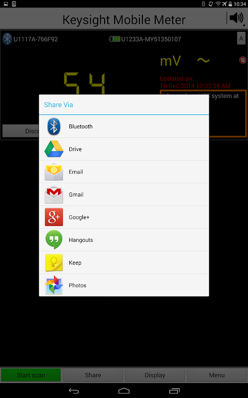 Keysight Technologies Remote Link solution improves your work efficiency and safety. Connect wirelessly to your Keysight U1200 series handheld digital multimeters or clamp meters via Bluetooth® wireless technology. The Keysight Mobile Meter enables you to view measurements from up to three Keysight handheld meters, extending your reach wirelessly to multiple points from a single location. Make measurements from a safe distance and eliminate the need to walk back-and-forth between measured points and control panel during trouble shooting. To further enhance safety during the probing of high-voltage circuits, the Keysight Mobile Meter includes a “voice-out” capability. This feature provides an audible output of your handheld meter readings through the text-to-speech engine in the Android device so that you can concentrate on the measurement task.