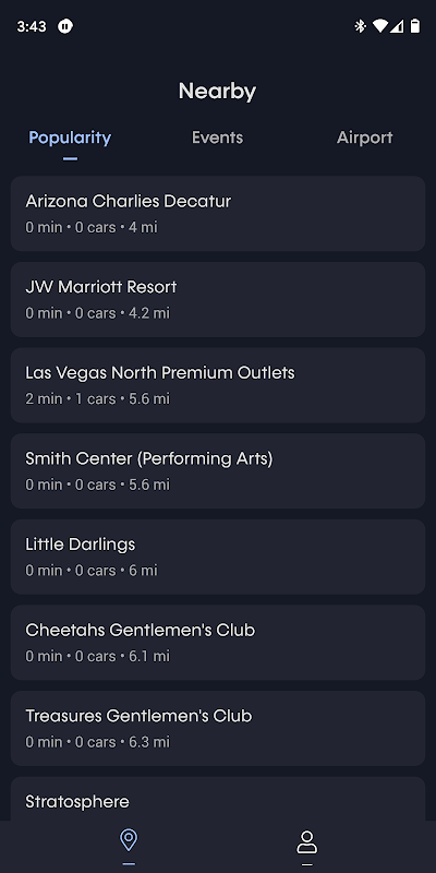 Убедитесь, что вы оптимизируете свое время в дороге, используя функцию «Рядом», которая отображает текущую статистику популярности, в том числе количество автомобилей Kaptyn, стоящих в очереди в данный момент, и среднее время ожидания для определенных мест в Лас-Вегасе, упорядоченных в порядке убывания расстояния от вас. !