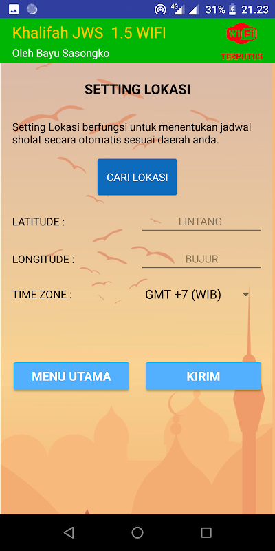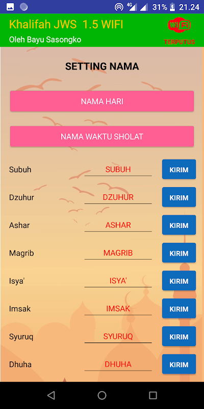 KHALIFAH JWS V1.5 WIFI adalah aplikasi yang digunakan untuk melakukan setting pada kontroller Jadwal Waktu Sholat dengan koneksi Wireless WIFI. Nama WIFI Default : KHALIFAH JWS WIFI, Password Default : 123456789. Silahkan laporkan jika ditemui bug di aplikasi ini.