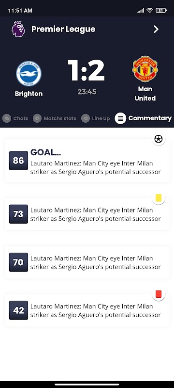 ✔ Действия в режиме реального времени (голы с передачами, карточки, пенальти, замены)