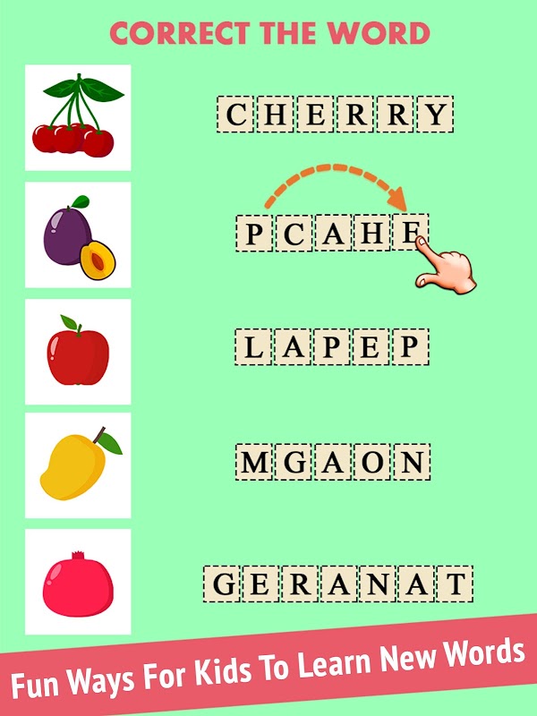 Find all jumbled letters in given word and link them to make the word! Your kids will have fun improving their vocabulary and spelling skills. Have difficulty coming up with the correct word? You can use hints to help solve the word. This is a perfect word game for kids who love word games. Download, and enjoy the word jumble puzzles game NOW!