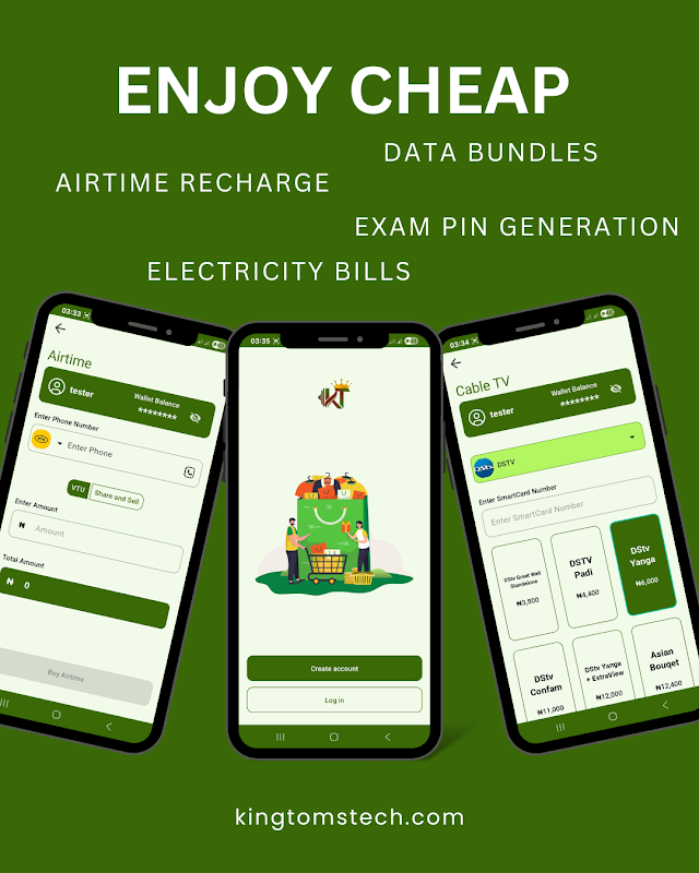 Kingtomstech — это надёжная платформа для быстрых, надёжных и доступных услуг VTU в Нигерии. Покупайте интернет, эфирное время, токены на электроэнергию, подписки на кабельное телевидение и экзаменационные пин-коды. Всё в одном месте.