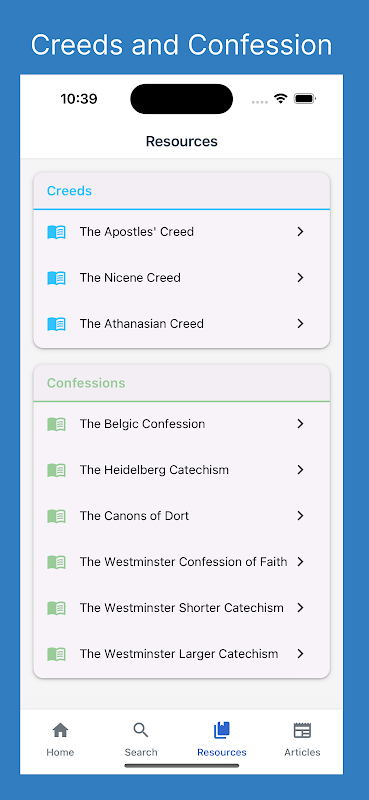 Цель этого приложения — предоставить верующим удобный способ читать, изучать и делиться этими классическими исповеданиями, помогая им глубже вникнуть в основные принципы христианской веры и укрепить свое понимание библейского учения. Будь то дома, в церкви или в повседневной жизни, это приложение служит ценным инструментом для богословского обучения и веры.