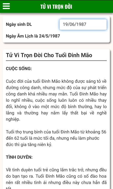 Tử vi trọn đời là chức năng cung cấp thông tin tử vi cho từng tuổi trong 12 con giáp. Các thông tin bao gồm: cuộc sống, tình duyên, gia đạo - công danh, những tuổi hợp làm ăn, lựa chọn vợ chộng, những tuổi đại kỵ, những năm khó khăn trong cuộc đời, và diễn tiến từng giai đoạn trong cuộc đời.
