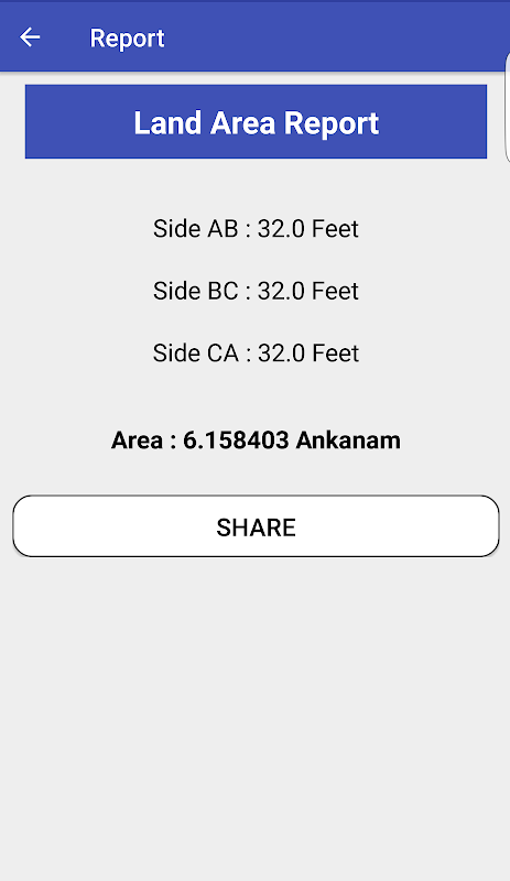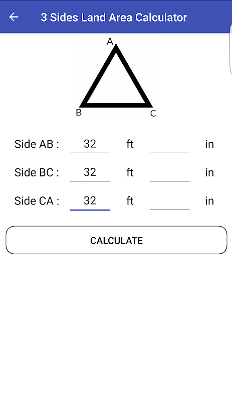 Вы можете рассчитать 4 стороны / 3 стороны / 5 сторон земли. В этом приложении вы также можете рассчитать площадь для различных форм, таких как треугольник, квадрат, прямоугольник, трапеция, ромб, параллелограмм, четырехугольник, многоугольник, круг и эллипс.