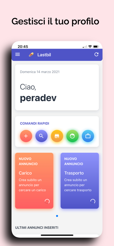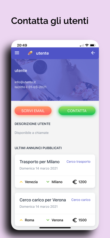 Crea un annuncio di ricerca carico o trasporto, contatta l'utente e finalizza il lavoro.